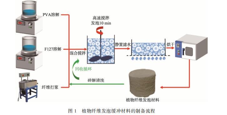 將375 g木纖維漿板泡入23 L去離子水中12 h,使用瓦力打漿機細(xì)化30 min,得到打漿度(°SR)為20的闊葉木纖維。將纖維與PVA、F127按不同比例混合,加入去離子水形成懸浮液。將懸浮液在5000 r/min下高速分散10 min,隨后倒入帶有100目篩網(wǎng)的模具中排水12 h,脫模后在100℃干燥12 h,獲得植物纖維發(fā)泡材料。