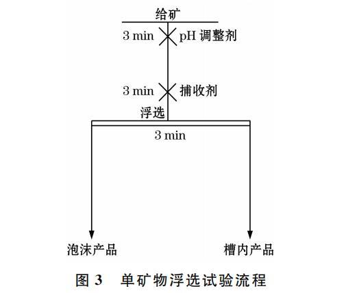 采用一次粗選的試驗(yàn)流程,探究十二胺(DDA)和YTDB在不同礦漿pH、不同捕收劑用量下,對(duì)石英以及赤鐵礦回收率的影響。單礦物浮選試驗(yàn)在XFD-Ⅲ浮選機(jī)進(jìn)行,在室溫條件下配制礦漿,稱取2.00 g的單礦物放入浮選槽中,再加入20 g去離子水,控制浮選機(jī)的攪拌速度為1900 r/min,攪拌2 min以充分?jǐn)噭虻V漿。加入事先準(zhǔn)備好的pH調(diào)整劑調(diào)漿3 min,再加入捕收劑調(diào)漿3 min后,開始刮泡,控制刮泡時(shí)間為3 min.浮選結(jié)束后,將精礦進(jìn)行過(guò)濾、烘干、稱重,隨后計(jì)算其回收率。單礦物浮選試驗(yàn)流程如圖3所示。