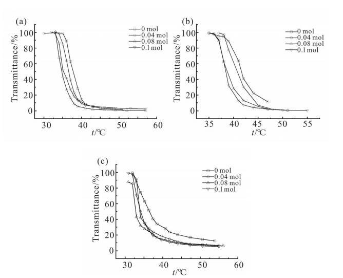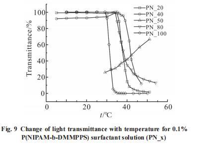 探究了P(NIPAN-b-DMMPPS)中PNIPAM嵌段含量對(duì)其臨界溶解溫度的影響,通過改變NIPAM與DMMPPS單體加料的比例,得到一系列PNIPAM嵌段含量不同的P(NIPAN-b-DMMPPS)嵌段共聚物。Fig.9為不同嵌段比例的表面活性劑溶液在500nm波長下的透光率隨溫度的變化。