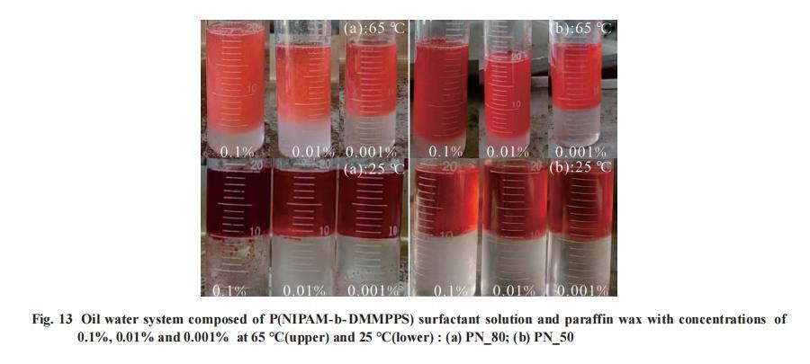 用PN_80進行乳化性能測試符合上述溫度響應機理。油水體系中,質量分數為0.1%的PN_80溶液能夠在高溫形成乳液,在溫度降低至25℃時破乳,如Fig.15所示。此嵌段聚合物LCST在36°C左右,低溫時PDMMPPS鏈段疏水收縮,PNIPAM鏈段親水舒展,聚合物整體表現為親水性;當溫度升高至65℃,PDMMPPS鏈段親水舒展,PNIPAM鏈段疏水收縮,聚合物整體表現疏水性。