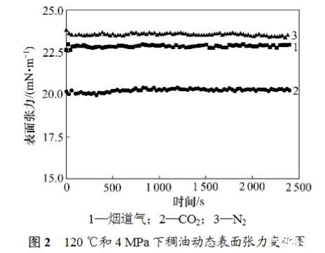 由于煙道氣在原油中具有一定的溶解度,油滴形成后,煙道氣會向原油中擴散、溶解,一直持續到油滴被煙道氣飽和。為了檢測氣體向原油中溶解、擴散對表面張力的影響,對煙道氣-稠油系統的動態表面張力進行測定。圖2所示為120℃和4MPa下測量的煙道氣-稠油動態表面張力,其中煙道氣組成為80%N2+20%CO2(摩爾分數),并與CO2-稠油和N2-稠油的表面張力進行對比。