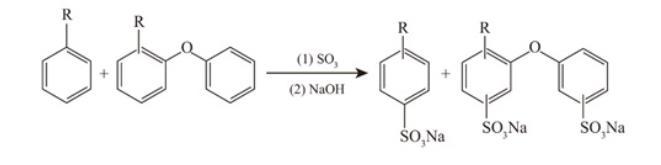 采用SO3膜式磺化工藝,改變烷基二苯醚與烷基苯的質量比,將二者混合進行磺化反應,然后用NaOH溶液中和,制得質量分數為25%的烷基二苯醚/烷基苯混合磺酸鹽,反應方程式如下: