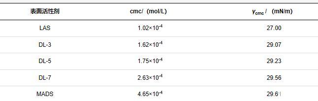 表2給出了混合磺酸鹽的臨界膠束濃度(cmc)和cmc時的表面張力(γcmc),可以看出,LAS展現出最佳的表面活性,隨著混合磺酸鹽中MADS含量的增加,cmc和γcmc呈增加趨勢,這是由于MADS分子中含有2個磺酸基團,親水性強,分子間靜電斥力大,不利于膠束的形成,且在氣/液排列時分子疏松,裸漏的-CH3密度小,即γcmc較高。