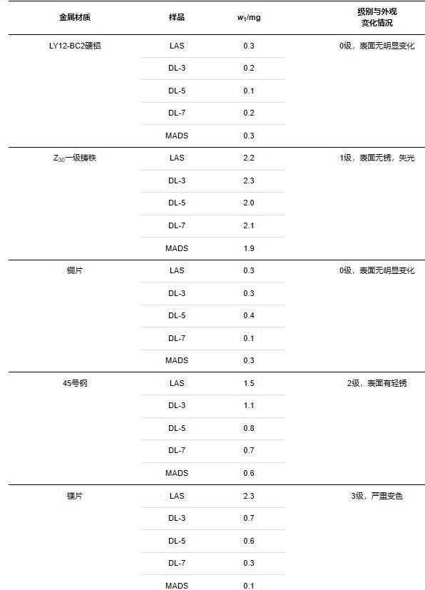 表面活性劑在使用過程中難免會接觸到金屬設備及容器,存在潛在的腐蝕問題[11]。本研究選用LY12-BC2硬鋁、Z30一級鑄鐵、銅片、45號鋼、鎂片這5種不同的金屬試片來模擬不同的金屬環境,對LAS、DL-n系列、MADS表面活性劑溶液進行金屬腐蝕性測試。通過觀察試片外觀變化以及腐蝕量計算來確定金屬腐蝕性級別。