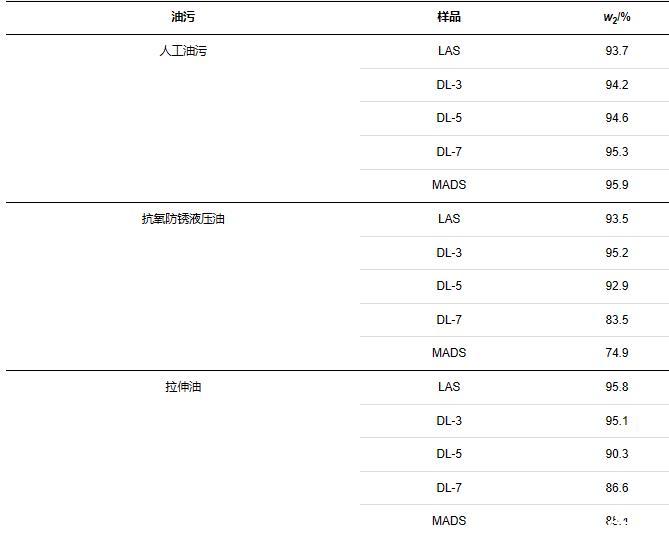 金屬凈洗力是指表面活性劑溶液在金屬表面去除污垢、油脂或其他污染物的能力,表面活性劑的金屬凈洗力直接影響其在工業清洗中的效果[12,13]。本研究選擇人工油污、抗氧防銹液壓油以及拉伸油模擬不同的工業場景,探究其對LAS、DL-n系列、MADS表面活性劑溶液凈洗力的影響。實驗結果如表4所示,可以看出:對于人工油污,隨著混合磺酸鹽中MADS含量的增多,凈洗力整體差異不大,都維持在90%以上;對于抗氧防銹液壓油與拉伸油,隨著混合磺酸鹽中MADS含量的增多,表面活性劑溶液親水性增加,對抗氧防銹液壓油、拉伸油乳化能力下降,凈洗力逐漸降低。