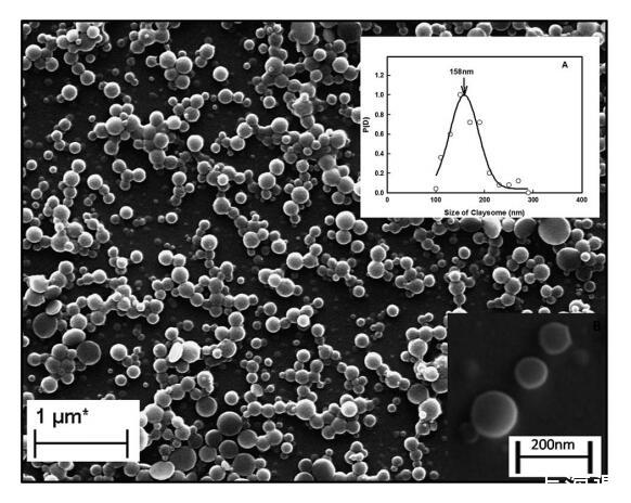 圖1顯示由納米粘土(0.05%)和姜黃素納米顆粒形成的粘土小體組裝體的SEM圖像。插圖(A)顯示了粘粒的高斯粒度分布(從SEM圖像獲得)。發現大多數粘土體(核-殼)顆粒的直徑為158±5 nm。插圖(B)顯示了由納米粘土殼和殼厚度為40 nm的姜黃素納米顆粒核形成的單個粘土體。