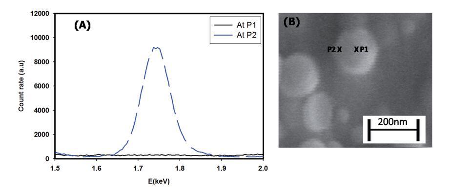 圖1顯示了核殼顆粒組裝的SEM圖像。這清楚地顯示了直徑為158±5 nm的球形顆粒(粒徑的高斯分布在插圖A中給出),具有暗芯和淺電暈(插圖B)。典型的磁芯直徑約為100 nm,電暈寬度約為40 nm。通過光散射實驗確定了組件的直徑。光散射數據分析得出的直徑為100–200 nm,最大顆粒數的直徑為161±10 nm,這與從SEM數據獲得的尺寸一致(從DLS獲得的顆粒尺寸的高斯分布在ESI?圖S2中給出)。EDAX結果證實了粘土片在組件中的位置。圖2(A)和(B)顯示了給定結構在兩個不同位置(xP1和xP2)的能量色散分布。它們清楚地顯示了核心(xP1)內不存在硅(粘土結構中的主要元素之一),以及日冕(xP2)中硅的豐度。33,34這證實了粘土片被排除在這些結構的核心之外。因此,可以得出結論,核心是疏水的,主要含有姜黃素納米顆粒(姜黃素不溶于水),而外殼(電暈)具有自組裝血小板的傾向(LAPONITE®不溶于乙醇)。因此,我們有一個結構,其中的核心是一個有機相(乙醇)周圍的水暈。由于其溶解性偏好,姜黃素納米顆粒和LAPONITE®血小板分別優先位于有機相和水相。