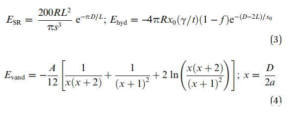 兩種平衡力在組裝的形成中起著重要作用:由兩種粒子之間的界面力控制的疏水相互作用,以及納米粘土團簇和系統疏水環境之間的空間斥力。因此,復雜核-殼(粘土小體)組裝的總能量由以下三個貢獻的總和給出:相鄰納米粘土團簇之間的空間斥力(ESR)、9疏水力(Ehyd)、9和范德華力(Evand):34