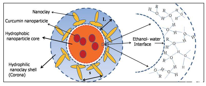 圖4示意圖顯示了在電暈中存在納米粘土團和限制在疏水核內的疏水姜黃素納米顆粒的粘土體結構的形成。