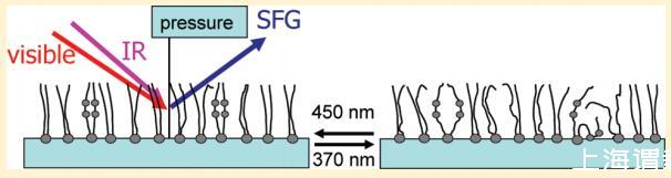 在此,我們研究了光開關脂質DT Azo-5P(圖1)的單層,其為純的,并與脂質1,2-二棕櫚酰-sn-甘油-3-磷酸膽堿(DPPC)混合。如圖1中的UV/vis光譜所示,光活性脂質可分別用370和450 nm的光從其反式狀態切換到順式狀態并返回。我們將表面壓力測量與無標簽、寬帶振動和頻率產生(VSFG)光譜相結合。10這些技術使我們能夠研究空氣-水界面上的脂質分子單層??梢垣@得有關脂質與水分子相互作用的信息以及脂質的分子結構。在非線性光學技術VSFG中,紅外(IR)光束和可見光(VIS)光束在界面處組合,產生具有兩個入射光束和頻率的信號。如果紅外線與分子振動共振,信號就會強烈增強。已經證明,這種通過分子振動的技術提供了有關脂質分子構象和取向的信息。11-18在中心對稱介質中禁止和頻產生,因為這是一種二階非線性光學過程。19因此,該技術對中心對稱材料(如水表面)的最外表面分子層敏感。相反,缺少信號表明界面上的材料或分子群是中心對稱的。對于金表面偶氮苯功能化自組裝單分子膜,SFG在測定光異構化的截面和機理方面非常有用。得出的結論是,光異構化是由直接電子激發驅動的,類似于液相中的偶氮苯