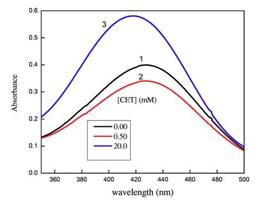 圖5.[CET]對水性甲酚紅染料可見光譜的影響:(1)[CET]=0mm,(2)[CET]=0.50mm,(3)[CET]=20mm。[CR]=3×10?5毫米。