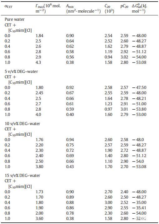 表4純CET、[C10min][Cl]和CET+[C10min][Cl]混合物的表面過剩(Γmax)、每分子最小面積(Amin)、吸附效率(pC20)和吸附自由能(ΔGad 0),作為純水中CET摩爾分數α的函數,并且在T=298.15K時存在不同體積百分比的二元DEG-水混合物。