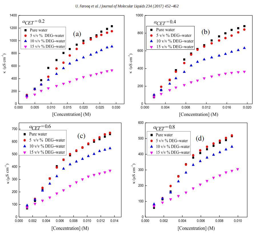 圖1。在T=298.15 K時,二甘醇-水二元混合物的不同體積百分比下,混合體系的比電導率,κ與[濃度]的曲線圖,CET+[C10min][Cl](a)αCET=0.2(b)αCET=0.4(c)αCET=0.6和(d)αCET=0.8。