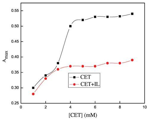圖6.含水鉻峰的最大吸光度與[CET]的變化(■)在沒有ILs和()的情況下,存在0.05 w/w%的[C10min][Cl]。