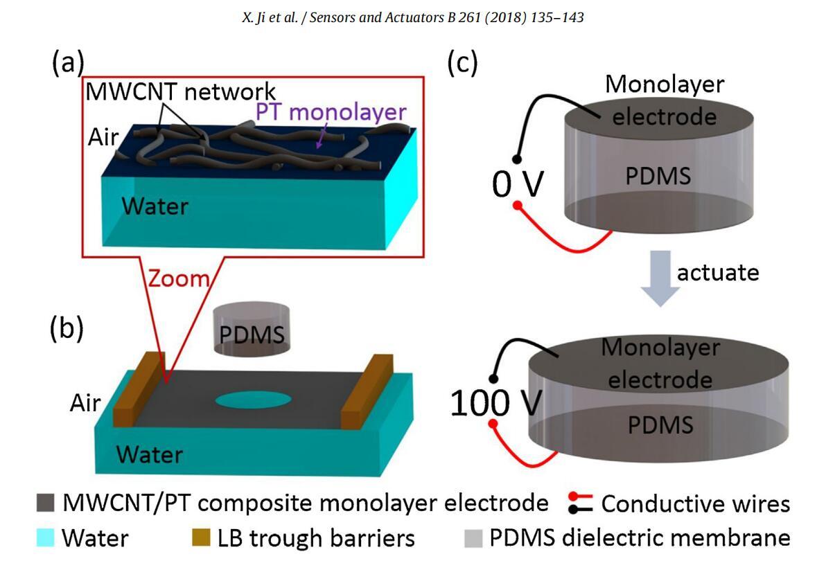 圖1。使用Langmuir-Schaefer轉移單層電極制作低壓DEA(a)在空氣-水界面形成的單層復合電極:嵌入聚(烷基噻吩)(PT)單層內的互連MWCNT網絡。(b)Langmuir-Schaefer(LS)將復合單分子膜從空氣-水界面轉移到PDMS介電膜上,制成DEA的一個電極。(c)DEA由一層1.4μm厚的硅酮膜組成,硅酮膜夾在兩個亞100 nm厚的復合單層電極之間。