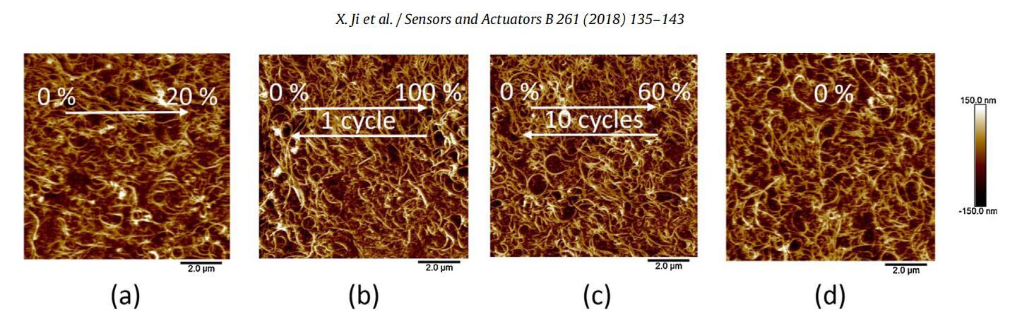 從圖5a(施加在PDMS基板上的20%單軸應(yīng)變)可以看出,WCNT在拉伸方向上輕微變形,但保持互連。對于應(yīng)變?yōu)?%的器件,在100%單軸應(yīng)變后或在60%單軸應(yīng)變的10個(gè)周期后拍攝,AFM圖像顯示互連的MWCNT網(wǎng)絡(luò),表明拉伸至100%(圖5b)或在60%單軸應(yīng)變的10個(gè)周期后(圖5c)不會(huì)破壞網(wǎng)絡(luò)。對于所有拉伸條件,與未施加任何應(yīng)變的樣品相比,一旦樣品松弛至0%應(yīng)變,則在該長度范圍內(nèi)未檢測到顯著的形態(tài)變化(圖5d)。