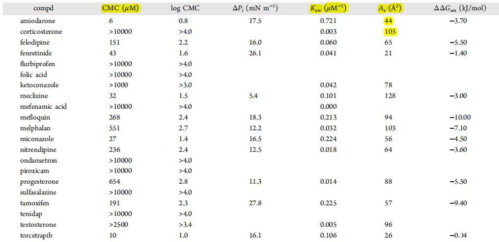表面活性測定。化合物在DMSO中連續(xù)稀釋超過12種不同濃度,并在pH值為6.5的0.05 M磷酸鹽緩沖液中添加至最終10%的DMSO含量。最終化合物濃度默認范圍為10 nM至10 mM。在第二次實驗中,對于達到溶解度極限或需要對相關(guān)濃度范圍進行解析以確定最佳參數(shù)的情況,定義了替代濃度范圍。樣品靜置10分鐘,以便在液體中平衡?空中接口。表面壓力分布在張力計(MultiPi WS1,Kibron Inc.,芬蘭赫爾辛基)上進行,通過之前的測量(72.8 mN/m)對50μL等份樣品進行校準。通過對生成的等溫線進行曲線擬合確定表面活性參數(shù),并根據(jù)經(jīng)典的空氣吉布斯熱力學(xué)理論進行計算?水里,臉上。主要導(dǎo)出參數(shù)如下。(i)考:空氣?水分配系數(shù),來自等式2