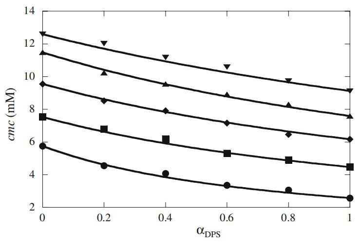 圖8 Mega-10+DPS混合系統(tǒng)的混合臨界膠束濃度(cmc)與αDPS的曲線圖。填充圓、正方形、菱形、三角形和反向三角形分別表示存在0(填充圓)、2(填充正方形)、4(填充菱形)、6(填充三角形)和8(填充反向三角形)mMα-CD時的實(shí)驗cmc。實(shí)線表示理想的cmc