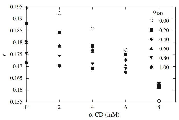 根據(jù)方程式15,我們計算了在不存在和存在α-CD的情況下當(dāng)前二元混合物的膠束組成(X1)。圖9顯示了混合膠束(X1)和體積摩爾分?jǐn)?shù)(α1)中表面活性劑的組成。從圖9可以得出結(jié)論,在αDPS=0.2時,混合膠束中DPS的組成接近40%。存在α-CD時的X1值始終低于水的X1值。這種行為可能反映出α-CD通過降低其結(jié)合最強(qiáng)的表面活性劑的量來改變成分(見Ka值)。一般來說,CDs不與膠束相互作用,但CDs可能通過與溶液中的表面活性劑相互作用影響膠束的組成,從而改變膠束的平衡和組成。熒光各向異性為了研究混合膠束中兩種不同組分的行為,我們還使用RB作為熒光探針進(jìn)行了偏振熒光測量。這種探針在膠束介質(zhì)中已經(jīng)得到了很好的表征[33]。探針熒光發(fā)射的去極化程度是其激發(fā)態(tài)壽命期間旋轉(zhuǎn)擴(kuò)散的度量。熒光各向異性(r)通過Perrin方程與探針周圍的粘度相關(guān),如下[34]: