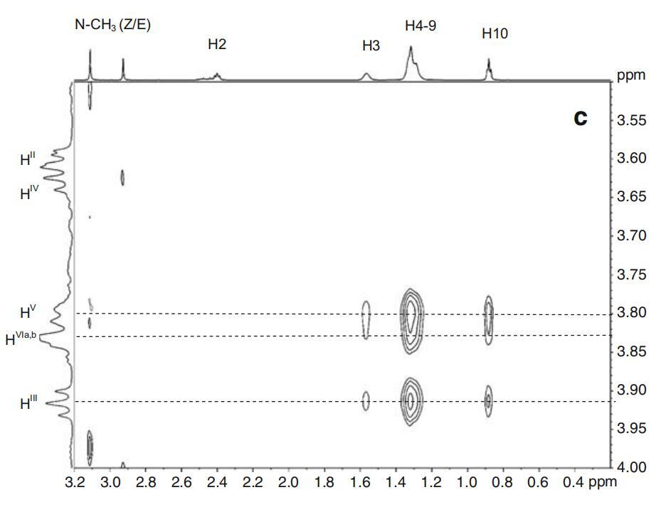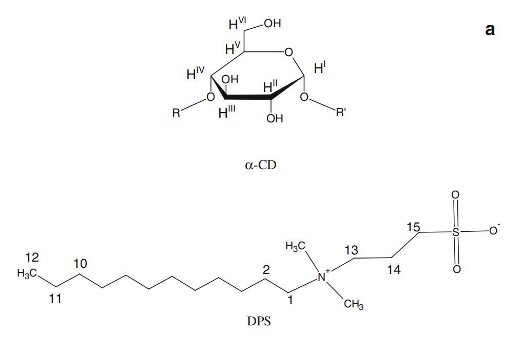 圖7a顯示了α-CD、DPS和Mega-10的示意圖,以簡化表面活性劑原子與CD原子的相互作用。2DROESY數(shù)據(jù)證明表面活性劑的烷基鏈包含在α-環(huán)糊精的疏水腔中。光譜如圖7b和c所示。可以看到表面活性劑共振與位于環(huán)糊精空腔內(nèi)的HIII、HV和HVI共振的交叉峰。未觀察到分子(HI、HII和HIV)外部與環(huán)糊精原子的相互作用。對于這兩種表面活性劑,與HIII和HV的相互作用似乎覆蓋了從末端甲基到H3的整個烷基鏈。這意味著幾個不同的復(fù)雜幾何形狀和穿透深度之間的快速交換。在鎘原子和親水性頭基之間沒有觀察到相互作用。