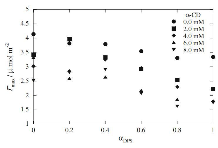 式中,γ、C、R、T和P為界面張力、表面活性劑濃度、理想氣體常數(shù)、溫度和壓力。純系統(tǒng)和混合系統(tǒng)的Γmax值如圖4所示。純Mega-10和DPS分子的Γmax值與文獻(xiàn)報道的值一致[26,28]。圖4顯示Mega-10的Γmax值略高于DPS。這一結(jié)果表明,與DPS相比,Mega-10分子在空氣-水界面以更緊湊的形式排列。兩種表面活性劑的Γmax值隨著α-CD量的增加而減小,表明表面活性劑物種從界面上的解吸(圖4)。這種行為是表面活性劑與α-CD之間存在相互作用的另一個證據(jù)。對于Mega-10和DPS在不同DPS摩爾分?jǐn)?shù)(αDPS)下的二元混合物,Γmax值隨著DPS量的增加而減小,表明DPS在界面上吸附后形成混合單層。