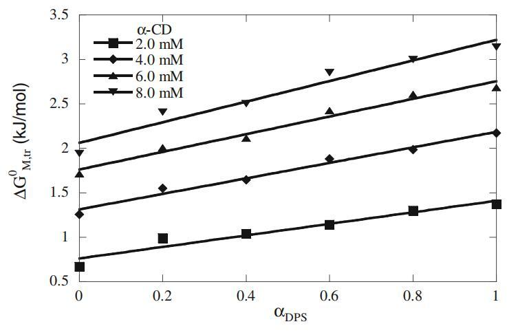 根據(jù)cmc值,我們評估了純表面活性劑系統(tǒng)和混合表面活性劑系統(tǒng)在不存在和存在α-CD的情況下的膠束化標(biāo)準(zhǔn)自由能(數(shù)據(jù)未顯示)[27],隨后,通過膠束轉(zhuǎn)移標(biāo)準(zhǔn)自由能評估添加劑對膠束化的影響(?GM,tr 0),從水相到含有α-CD的水相[19]。這些值如圖5所示,在不同α-CD濃度下,在整個DPS摩爾分?jǐn)?shù)范圍內(nèi)為正值,表明α-CD的存在使膠束形成不利。此外,這些值隨著α-CD濃度的增加而線性增加,在高α-CD濃度下斜率更高,表明混合膠束的形成延遲。