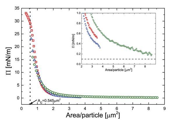 壓力-面積等溫線是通過(guò)在Langmuir槽上對(duì)擴(kuò)散單分子膜進(jìn)行3組不同實(shí)驗(yàn)得到的。這些等溫線中的面積坐標(biāo)根據(jù)吸附在界面上的顆粒數(shù)量進(jìn)行縮放。如圖1所示,所有曲線都折疊到一個(gè)圖上。在增加壓縮時(shí),壓力最初略有變化,但低于2 mm2/顆粒時(shí),壓力急劇增加。曲線的斜率首先增加,但在約27 mN m-1處達(dá)到最大值,在此有一個(gè)拐點(diǎn),然后是一個(gè)稍弱的斜率。如圖1中的虛線所示,對(duì)應(yīng)于該拐點(diǎn)的每粒子面積(Ac)值為0.545 mm2。假設(shè)粒子緊密堆積,這對(duì)應(yīng)于~835 nm的粒子間距離,遠(yuǎn)大于在本體溶液中測(cè)量的粒子流體動(dòng)力學(xué)直徑(590 nm),表明粒子確實(shí)發(fā)生了實(shí)質(zhì)性變形。如圖1的插圖所示,0.5 mN m-1級(jí)的有限表面壓力(即遠(yuǎn)高于我們的檢測(cè)極限0.1 mN m-1)實(shí)際上已經(jīng)可以在約4 mm2的每粒子面積上測(cè)量。插圖還表明,在兩個(gè)不同的朗繆爾槽上進(jìn)行的不同實(shí)驗(yàn)之間,P的絕對(duì)值在0.3 mN m-1范圍內(nèi)可重復(fù)。