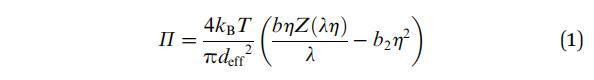 吸附在流體-流體界面上的顆粒相互作用并產(chǎn)生表面壓力(P),這是3D系統(tǒng)中壓力的2D模擬。通過(guò)進(jìn)一步擴(kuò)展這種類(lèi)比,還可以通過(guò)狀態(tài)方程將表面壓力與其他狀態(tài)參數(shù)(如數(shù)密度和溫度)聯(lián)系起來(lái)。對(duì)于吸附在流體-流體界面上的膠體粒子,最簡(jiǎn)單的近似可能是2D硬盤(pán)。單組分系統(tǒng)的狀態(tài)方程(EOS)是根據(jù)壓縮因子Z的密度依賴(lài)性給出的。文獻(xiàn)中充滿了多種方法來(lái)提供2D硬盤(pán)流體狀態(tài)方程的表達(dá)式。Mulero等人27,28簡(jiǎn)要回顧和比較了所有這些狀態(tài)方程。