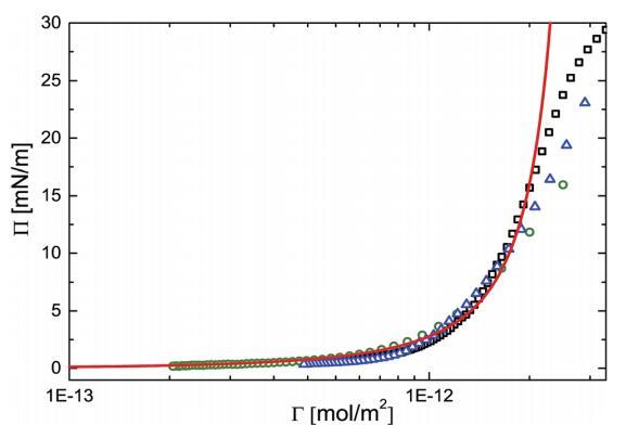 圖2表面壓力(P)與空氣-水界面上PNIPAM顆粒吸附量(G)的關(guān)系。開(kāi)放符號(hào)表示與三組不同實(shí)驗(yàn)相對(duì)應(yīng)的實(shí)驗(yàn)數(shù)據(jù)點(diǎn),即:(,)具有高初始顆粒負(fù)荷的NIMA槽,(B)具有低初始顆粒負(fù)荷的NIMA槽和(D)具有高初始顆粒負(fù)荷的Kibron m槽。紅色實(shí)線表示使用Groot和Stoyanov模型進(jìn)行的預(yù)測(cè)。