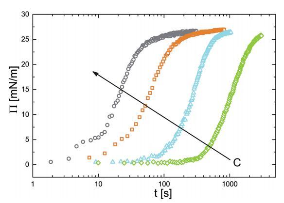 在建立了一個(gè)狀態(tài)方程來(lái)關(guān)聯(lián)表面壓力和吸附量之后,我們現(xiàn)在開(kāi)始研究粒子的吸附動(dòng)力學(xué)。為此,我們監(jiān)測(cè)了PNIPAM顆粒懸浮液中新制備氣泡的界面張力隨時(shí)間的變化。我們將界面張力值轉(zhuǎn)換為表面壓力。結(jié)果如圖4所示。表面壓力值最初迅速增加,然后放松到最終平衡值。動(dòng)力學(xué)可以清楚地分為兩個(gè)獨(dú)立的時(shí)間尺度:一個(gè)是表面壓力值增加表示的初始快速動(dòng)力學(xué),另一個(gè)是系統(tǒng)向最終平衡狀態(tài)松弛時(shí)的緩慢部分。短時(shí)間快速動(dòng)力學(xué)和長(zhǎng)時(shí)間慢得多動(dòng)力學(xué)之間的區(qū)別是許多表面活性材料吸附行為的特征。32,33