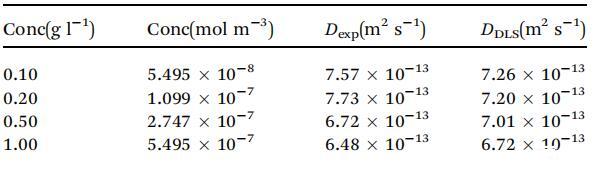 表1根據(jù)實(shí)驗(yàn)G與t1/2曲線計(jì)算的不同濃度的擴(kuò)散系數(shù)D(m2 s-1)值與使用DLS測(cè)量的值相比