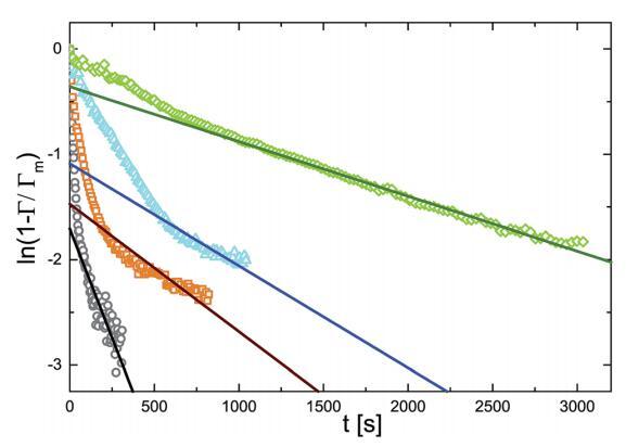 圖6表明,這種勢(shì)壘控制機(jī)制確實(shí)長(zhǎng)期存在。開(kāi)放符號(hào)是ln(1-Γ/Γmax)的實(shí)驗(yàn)值。在很長(zhǎng)的時(shí)間內(nèi),曲線擬合一條由實(shí)線表示的直線。實(shí)線的斜率可以確定為1/k的動(dòng)力學(xué)弛豫時(shí)間的倒數(shù)。