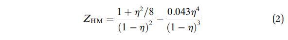 式中,η是表面堆積分?jǐn)?shù),它可以用顆粒數(shù)密度(p)和單個(gè)顆粒的體積直徑(d)表示為η=(π/4)pd2。對(duì)于我們的實(shí)驗(yàn),η介于0和0.91之間。ZHM的相應(yīng)值介于1和96之間。