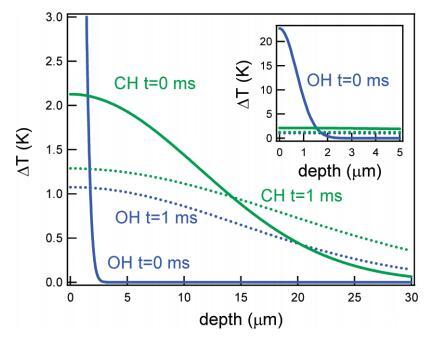 圖9。對于與CH(綠色)或OH(藍色)振動共振的紅外光束,溫度隨著進入水層的深度而升高。實線和虛線分別表示t=0和t=1 ms。插圖顯示了相同的圖形,但帶有擴展的yaxis。