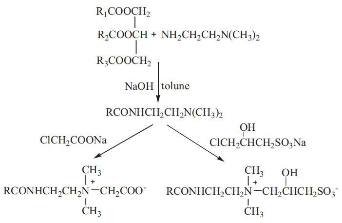 羧基甜菜堿和磺基甜菜堿表面活性劑OCB和OSB已通過兩步程序成功合成,如方案1所示。第一步是以DMAEA為中間體,從橄欖油的甘油三酯中分離出單甘酯,制備橄欖油酰胺(OA)。第二步是OA分別與氯乙酸鈉和CHPSNa進(jìn)行季銨化。具體程序如下: