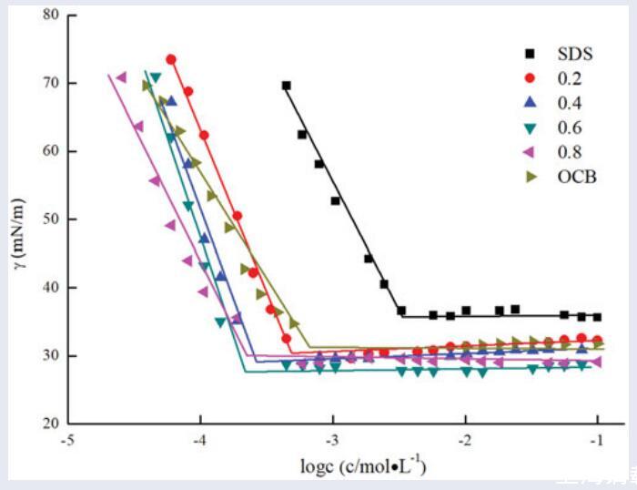 用表面張力法研究了橄欖油兩性表面活性劑(羧基甜菜堿OCB和磺基甜菜堿OSB)與陰離子表面活性劑十二烷基苯磺酸鈉(SDBS)在不同摩爾分?jǐn)?shù)下的表面性質(zhì)。研究了無機(jī)鹽(NaCl、MgCl2)的加入對OCB/SDBS和OSB/SDBS體系表面活性的影響。結(jié)果表明,這兩種混合體系在所研究的所有摩爾分?jǐn)?shù)上都比它們各自的組分具有更低的CMC值和更高的表面活性。同時(shí),根據(jù)正規(guī)溶液理論,通過膠束相互作用參數(shù)(βm)確定了OCB/SDBS和OSB/SDBS之間明顯的協(xié)同作用。觀察到,αOCB=0.6時(shí)的OCB/SDBS混合體系和αOSB=0.6時(shí)的OSB/SDBS混合體系表現(xiàn)出最強(qiáng)的協(xié)同作用。此外,添加無機(jī)鹽后,二元表面活性劑混合物表現(xiàn)出更好的表面活性,并且無機(jī)鹽金屬離子的不同價(jià)態(tài)對混合體系的表面能力影響不同:Mg2+>Na+。
