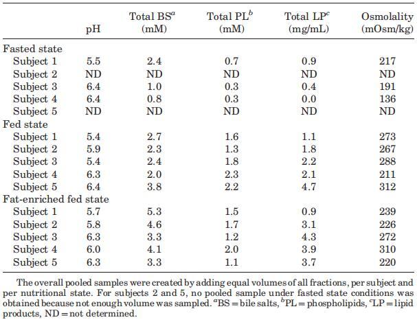 攝入Sure Plus1或Scandishake Mix1后前2小時的滲透壓通常高于禁食狀態(tài)下的HIF,盡管禁食狀態(tài)和兩種喂食狀態(tài)之間未達到顯著差異。禁食狀態(tài)滲透壓值一般為低滲透,或接近等滲透值。224 mOsm/kg的總體中值為低滲透性,與Brouwers等人1和Deferme等人報告的人類十二指腸吸出物的平均滲透壓一致。,38但高于Perez de la Cruz Moreno等人報告的平均值。24在給藥(n?3)后,在混合樣品中獲得的滲透壓較低,與Kalantzi等人11和Gisolfi等人報告的滲透壓較好。39在喂食和富含脂肪的喂食狀態(tài)下均發(fā)現(xiàn)高滲值,尤其是在消化的前3小時。在喂食和富含脂肪的喂食狀態(tài)下,總的中位數(shù)滲透壓為等滲透壓(分別為285和278 mOsm/kg)。進食后180分鐘內較高的滲透壓與膽汁鹽濃度、磷脂或脂質產(chǎn)物總量無關。Kalantzi等人19將吸入十二指腸內容物的高滲值歸因于雙糖和果糖復合碳水化合物的存在,以及后者的緩慢吸收。在本研究中未確定總碳水化合物水平,因此,該陳述無法驗證。