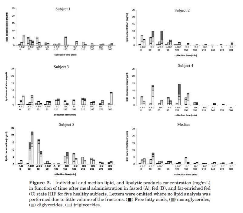 對于四名受試者(S2、S3、S4、S5),在禁食狀態(tài)HIF中發(fā)現(xiàn)微量脂質(平均0.4?0.3 mg/mL),這與Armand等人12報告的受試者1十二指腸吸出物中的禁食水平0.6 mg/mL相符,禁食狀態(tài)下的脂質濃度等于或高于30-120分鐘期間在喂食和富含脂肪的喂食狀態(tài)下測定的濃度(圖2)。這一觀察的可能原因可能與胃滯留時間和/或小腸上皮細胞的周轉率有關,從而釋放膜脂。在喂食和富含脂肪的喂食狀態(tài)之間,根據(jù)個體特征,沒有發(fā)現(xiàn)實質性差異。然而,中位數(shù)曲線顯示,進食30分鐘后,在高脂肪喂養(yǎng)狀態(tài)下,總脂質濃度顯著增加。由于沒有觀察到脂質產(chǎn)物在管腔內出現(xiàn)延遲,因此可以得出結論,服用液體膳食的脂肪含量的應用差異不會改變胃排空。先前已經(jīng)證明,給予恒河猴的碳水化合物、蛋白質和脂肪等熱量負荷產(chǎn)生了相似的胃排空率,這表明胃排空是根據(jù)膳食的熱量密度進行調節(jié)的,而不管其營養(yǎng)成分如何。32