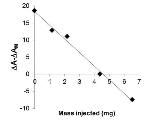 脂質(zhì)體(不同濃度)對(duì)BSP蛋白的作用也如圖5所示。脂質(zhì)體在進(jìn)入亞階段前與精漿接觸。隨著脂質(zhì)體中濃度的增加(曲線M/SP+C1至C4),BSP蛋白吸附引起的表面積增加逐漸延遲并減少。當(dāng)含量達(dá)到4.37 mg(C3)時(shí),界面上仍有少量BSP蛋白摻入,1600 s時(shí)出現(xiàn)肩部。在最高濃度(C4)下,未觀察到BSP蛋白摻入,分子面積的變化甚至比對(duì)照曲線更負(fù),表明膜組分在亞相中輕微溶解。因此,脂質(zhì)體作用于BSP蛋白的方式與LDL相同。最有趣的比例似乎介于C3和C4之間。根據(jù)確定面積變化與脂質(zhì)體注射磷脂質(zhì)量之間相互作用的曲線計(jì)算得出(圖6)。注射26.6 mg BSP的最佳質(zhì)量為4.6 mg,即PC:BSP比為0.16(w/w)。