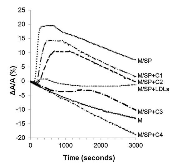 當(dāng)LDL與牛精漿以重量-蛋白質(zhì)比10:1(BSP:LDL)混合并注射到單層下方時(shí),隨時(shí)間記錄的單層分子面積幾乎沒(méi)有變化(曲線M/SP+LDL,圖5)。400秒左右出現(xiàn)一個(gè)肩部,顯示BSP蛋白的弱吸附(該肩部代表M/SP的5%,上圖曲線)。然后,分子面積的變化在1000秒后減小并趨于穩(wěn)定。其下降幅度不如M和M/SP曲線的變化幅度大,表明LDL組分吸附,與它們?cè)诮缑嫔系母邤U(kuò)散能力一致(曲線M/LDL,圖4)。因此,由于低密度脂蛋白(LDL),SP中BSP蛋白在界面上的吸附大大減少,BSP/LDL的比率非常接近最佳值,以完全防止BSP蛋白影響單層。根據(jù)低密度脂蛋白的組成,注射磷脂酰膽堿的量估計(jì)為4.61毫克[33]。因此,向4.61 mg低密度脂蛋白磷脂酰膽堿注射26.6 mg精漿蛋白質(zhì),即0.17 mg磷脂酰膽堿注射1 mg精漿蛋白質(zhì)。