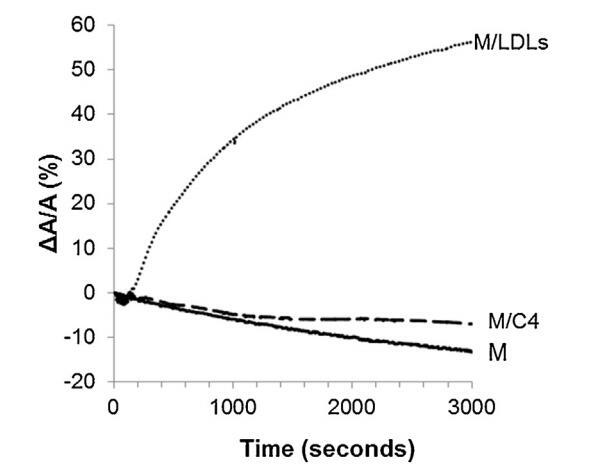 圖4。單層(M)所覆蓋的界面的相對(duì)表面積隨時(shí)間的變化,該單層(M)以25 mN/M的速度壓縮,并在不含任何額外分子(-)的緩沖液上形成,(…)LDL(4.6 mg PC)和(-)脂質(zhì)體C4(含4.8 mg PC)。氣溫是34度?C在空氣-緩沖器接口處。