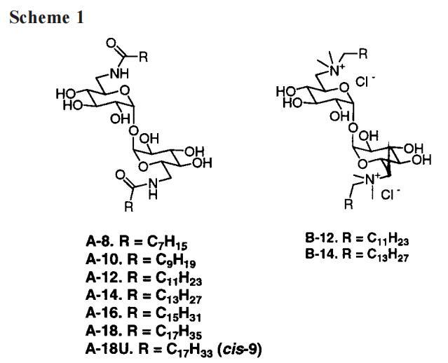 本文研究以海藻糖為間隔基的雙子座(方案1)。A系列由海藻糖組成,其6-和6′-羥基被長鏈酰胺取代。B系列在6-和6′位置有長鏈季銨鹽基團。我們選擇海藻糖作為糖間隔物并不是隨意的。首先,海藻糖是一種雙糖,允許兩條烴鏈相隔相當(dāng)長的距離。雙子座中受限的分子內(nèi)鏈/鏈相互作用是一種結(jié)構(gòu)特征,過去僅對其進行了簡要研究。15秒后,海藻糖(一種從細菌、藻類、昆蟲和植物等多種自然來源中分離出來的糖)可以保護生物膜免受脫水的壓力。16因此,在生物膜的“細胞模擬”建模方面,我們對海藻糖雙子感興趣。17第三,從實用的角度來看,海藻糖很有吸引力,因為它包含兩個完全相同的D-葡聚糖單元。這簡化了化合物的合成和分析,與大多數(shù)其他雙糖相比,化學(xué)性質(zhì)不同的羥基數(shù)量減少了一半。但盡管對稱,合成純海藻糖雙子座的途徑(方案2和方案3)無疑是隨后物理化學(xué)的一個乏味的序言。