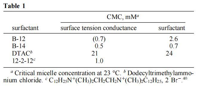 B-12和B-14確實是水溶性化合物,在臨界膠束濃度(CMC)以上形成膠束,動態(tài)光散射顯示顆粒大小小于5nm。CMC值是通過表面張力-濃度曲線(圖4)和電導(dǎo)率-濃度曲線(圖5)中的斷裂來確定的。38表1給出了結(jié)果數(shù)據(jù)(以及兩種常規(guī)表面活性劑的數(shù)據(jù),用于比較)。如圖所示,B-12的CMC值通過張力測量法和電導(dǎo)測量法(這兩種方法都是可重復(fù)的)得出的結(jié)果不一致。這種差異至少部分可以追溯到B-12表面張力的時間依賴性。因此,在10分鐘的過程中,B-12水溶液的表面壓力增加了10 mN/m,之后趨于穩(wěn)定。這種動態(tài)表面張力過程(之前已經(jīng)用雙子座表面活性劑觀察到)13,15,39可能與雙子座表面活性劑在空氣/水界面組織方面的困難有關(guān)。為了解決這個問題,圖4中的B-12溶液在表面張力測量之前老化20分鐘,從而減少了系統(tǒng)尚未平衡的可能性。盡管采取了這種預(yù)防措施,但我們無法確定依賴時間的界面重組是否不會影響B(tài)-12圖,并導(dǎo)致基于張量和電導(dǎo)的數(shù)據(jù)之間的差異。當(dāng)然,后者來源于不受界面事件影響的大塊特性,因此更可靠。有趣的是,B-14沒有表現(xiàn)出隨時間變化的表面張力,兩種方法確定的CMC值是合理一致的。也許更長的鏈既增強(qiáng)了對空氣/水界面的親和力,也增強(qiáng)了從溶液中吸收界面的動力學(xué)。