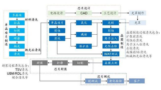 芯片制造技術(shù)的進(jìn)步驅(qū)動(dòng)半導(dǎo)體清洗技術(shù)快速發(fā)展。在單晶硅片制造中,光刻,刻蝕,沉積等工藝后均設(shè)置了清洗工藝,清洗工藝在芯片制造進(jìn)程中占比最大,隨著芯片技術(shù)節(jié)點(diǎn)不斷提升,對晶圓表面污染物的控制要求也越來越高。