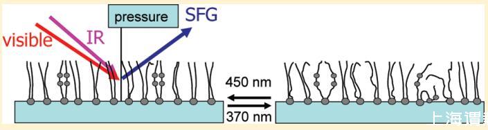 在此,我們研究了光開關(guān)脂質(zhì)DT Azo-5P(圖1)的單分子膜,該單分子膜是純的,并與脂質(zhì)1,2-二棕櫚酰-sn-甘油-3-磷酸膽堿(DPPC)混合。如圖1中的紫外/可見光譜所示,光活性脂質(zhì)可分別在370 nm和450 nm的光照下從其反式狀態(tài)切換到順式狀態(tài)并返回。我們將表面壓力測量與無標(biāo)簽、寬帶振動和頻產(chǎn)生(VSFG)光譜相結(jié)合。這些技術(shù)使我們能夠研究空氣-水界面上的脂質(zhì)分子單層??梢垣@得有關(guān)脂類與水分子相互作用的信息以及脂類的分子結(jié)構(gòu)。在非線性光學(xué)技術(shù)VSFG中,紅外(IR)光束和可見光(VIS)光束在界面處組合,產(chǎn)生具有兩個入射光束和頻率的信號。如果紅外與分子振動共振,信號就會強(qiáng)烈增強(qiáng)。研究表明,這種通過分子振動的技術(shù)可以提供有關(guān)脂類分子構(gòu)象和取向的信息。11-18和頻產(chǎn)生在中心對稱介質(zhì)中是被禁止的,因?yàn)樗且粋€二階非線性光學(xué)過程。19因此,該技術(shù)對中心對稱材料(例如水表面)的最外表面分子層敏感。相反,缺少信號表明界面上的材料或分子基團(tuán)是中心對稱的。對于金表面偶氮苯功能化的自組裝單分子膜,SFG在確定光異構(gòu)化的截面和機(jī)理方面非常有用。得出的結(jié)論是,光異構(gòu)化是由直接電子激發(fā)驅(qū)動的,類似于液相中的偶氮苯。3我們將表明,通過切換光脂,可以可逆地控制脂質(zhì)的表面壓力和分子順序。在同時含有光脂和脂質(zhì)DPPC的混合單分子膜中,我們可以通過光學(xué)切換偶氮苯基脂質(zhì)來控制DPPC的順序。這為體外控制脂質(zhì)-脂質(zhì)相互作用提供了一種新的手段。