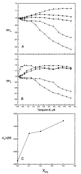 圖2:通過芘標記的磷脂PPDPC(X)0.01的熒光評估顳葉素B對LUV中脂質動力學的影響,分別顯示為芘單體和準分子發射強度Im(圖A),Ie(圖B)的變化,以及在RFIm中達到飽和反應之前Im增加的斜率(圖C)。脂質體由SOPC組成,XPOPG為0(0)、0.10(9)、0.20(b)和0.40(2),Xchol為0.10(3)。總體積為2 mL的5 mM Hepes,0.1 mM EDTA,pH 7.0,脂質濃度為20μM。使用循環水浴將溫度保持在25°C。每個數據點代表三次測量的平均值。標準偏差小于0.02(面板A和B)和0.004(面板C),為清晰起見,未顯示。