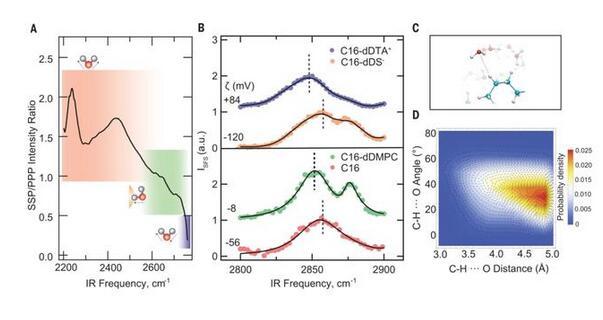 十六烷液滴在D2O中的SFS光譜中~100 cm?1的相當(dāng)大的頻率偏移(由灰色峰形突出)表明,電荷必須從水的O–D基團(tuán)轉(zhuǎn)移到油相的十六烷C-H基團(tuán)上,因?yàn)樗鼈兪墙邮茈娮用芏鹊奈ㄒ缓蜻x基團(tuán)。如果存在如此強(qiáng)的相互作用,即可以預(yù)期油分子的振動(dòng)模將經(jīng)歷向與高頻O-D模相反的方向移動(dòng)。這種遷移應(yīng)伴隨著結(jié)構(gòu)的變化,如C–H???O H鍵的存在。為了研究這一點(diǎn),記錄了界面C-H模的SFS譜,并進(jìn)行了MD模擬。界面C-H模的SFS譜圖顯示了CH 2(CH 2-ss)和CH 3(CH 3-ss)的對(duì)稱拉伸模在~2850和~2878 cm?1附近。十二烷-水界面顯示水和油分子相互作用讓人聯(lián)想到水和油之間的H鍵。作為C-H鍵的弱H鍵的受體,水分子上的O孤對(duì)提供了一些電子密度,使十二烷分子帶一個(gè)負(fù)電荷。