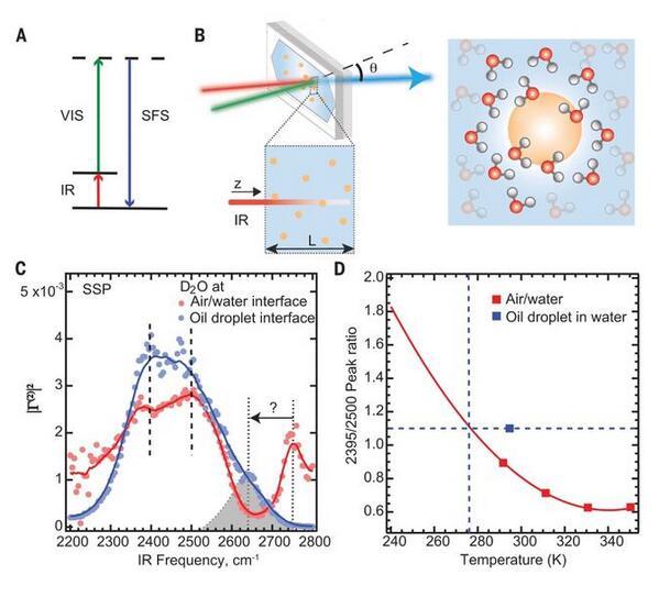 氫的疏水性代表了一種基本的物理性質(zhì),它決定了水介質(zhì)中的各種過程,如蛋白質(zhì)折疊、自組裝和聚集。亞微米級(jí)疏水油滴或水微粒是了解疏水作用機(jī)理的重要模型系統(tǒng)。然而,這些界面的電荷和結(jié)構(gòu)都有很大的爭(zhēng)議。雖然電荷轉(zhuǎn)移模型表明水是油滴電荷存在的關(guān)鍵,但油滴旁邊的水的結(jié)構(gòu)同樣存在爭(zhēng)議。因此,疏水液體材料旁邊的水的結(jié)構(gòu)仍然是未知的。