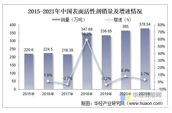 2015-2021年中國(guó)表面活性劑銷(xiāo)量及增速情況