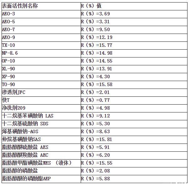 R值越大,表明凈洗能力越強(qiáng),該測(cè)試標(biāo)準(zhǔn)可用來表征表面活性劑對(duì)一般污垢的去除,不適用于反映油脂和蠟質(zhì)的去除能力。